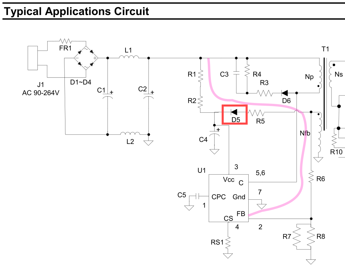 I believe this is D5 for the AP3983R, acting as the main power supply for the chip, from the feedback winding, after R1/R2 provide the bootstrap.