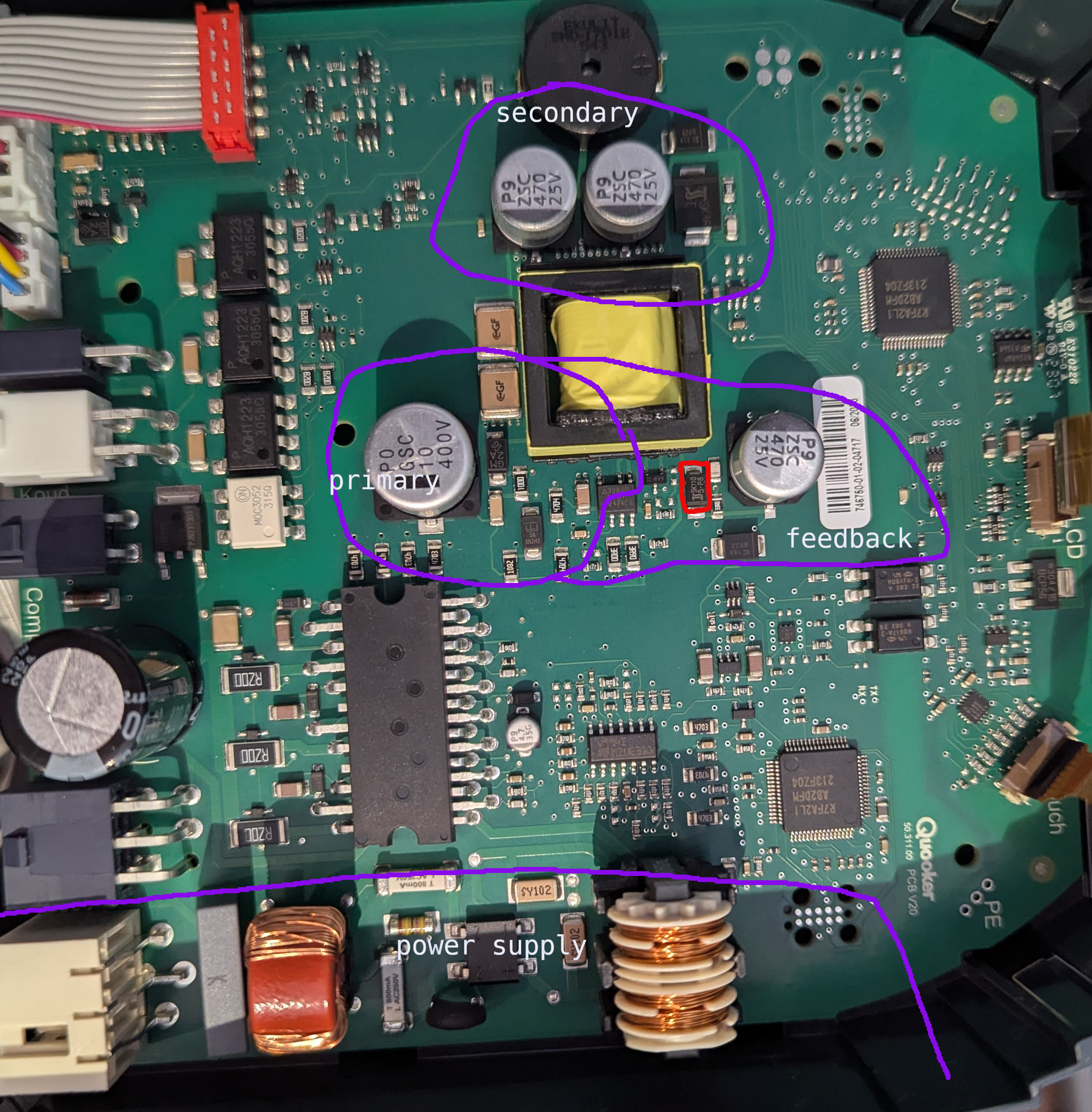 Slightly weird board layout, with the main voltage conversion "primary" situated a significant distance from the mains input "power supply":